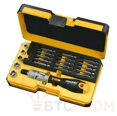 Набор инструмента и оснастки Felo предназначен для монтажно-демонтажных и ремонтных работ с различного рода крепежом (SL, PH, PZ, Torx, НЕХ ). Набор Felo содержит 15 бит, 5 торцевых головок, переходник (адаптер) на головки и поворотную на 180° трещотку ERGONIC K. Трещотка Felo ERGONIC K с храповым механизмом - это сочетание запатентованной рукоятки, храпового поворотного на 180° механизма на 48 зубьев и быстрозажимного патрона на 1/4 дюйма. Гладкая бесшовная рукоятка позволяет работать с различного рода крепежом с усилием до 50 Нм, а улучшенный поворотный механизм облегчает доступ к труднодоступным местам. Вся оснастка Felo изготовлена из высококачественной инструментальной стали (CrMoV), закаленной в масле, обеспечивающей повышенный рабочий ресурс. Инструмент поставляется в компактном ударопрочном пластиковом кейсе. Набор Felo подходят для ежедневного профессионального использования. Страна производства - Германия. Состав набора: Биты 1/4" E 6.3 50 мм: SL 4,0 / 6,5 / PZ1 / PZ2 / PZ3 / PH1 / PH2 / PH3 / Tx15 / Tx20 / Tx25 / Tx30 / НЕХ 3,0 / НЕХ 4,0 / НЕХ 5,0; Головки, мм: 7, 8,10,12,13; Поворотная трещотка с рукояткой Ergonic K; Переходник E 6.3 - 1/4"" (50 мм); Ударопрочный пластиковый кейс