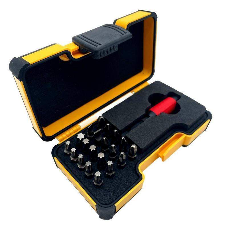 Набор оснастки, состоящий из бит Industrial и битодержателя Star, предназначен для монтажа/демонтажа крепежных изделий типа SL, PH, PZ, Torx с помощью шуруповерта или отвёртки под биты. Биты Felo изготовлены из хром-молибден-ванадиевой стали, закаленной в масле, обеспечивающей бОльшую износоустойчивость по сравнению с обычными битами. Магнитный держатель для бит Felo серии Star оснащен мощным подпружиненным магнитом, который автоматически обеспечивает надежное крепление биты 25мм. Подвижная втулка индивидуально подгоняет биту к головке каждого винта. Не нужно держать винт руками, одна рука остается свободной для определения точного места крепления заготовки. Даже тяжелые винты надежно удерживаются во всех рабочих положениях и на любых скоростях! Состав набора: Биты SL 5,5х1,0 / 6,5х1,2 / 3 х PZ 2 / 1 х PZ 3 / 3 х РН 2 / 1 х РН 1 / 3 х Torx 20 / 3 х Torx 25 / 3 х Torx 30 / 1 х Torx 40; Битодержатель Star; Ударопрочный кейс Strongbox.