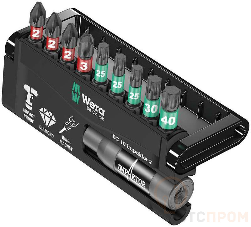 Набор бит ударных с битодержателем Bit-Check 10 Impaktor 2 10 предметов 1/4дюйм C6.3 Wera WE-057682