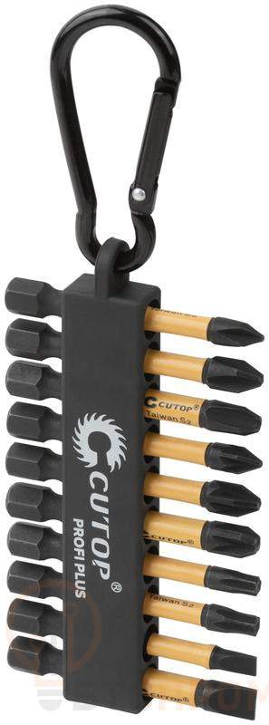 Набор торсионных бит Cutop Profi Plus, состоящий из 10 предметов, предназначен для использования с шуруповертами и гайковертами. Подходит для работы с ударным инструментом. Биты произведены по технологии CUTOP, изготавливаются из тайваньской стали высшего качества марки S2. За счет эффекта скручивания торсионная бита способна к работе на высоких крутящих моментах, что способствует сохранению шлица биты, крепежа и увеличенному сроку службы. Намагниченный шлиц обеспечивает дополнительное удобство в работе, а также предотвращает выскальзывание, что препятствует повреждению биты и крепежа. Биты выдерживают существенный крутящий момент, что подтверждается собственными испытаниями. Набор крепится на карабин, что способствует скорости и удобству работ.