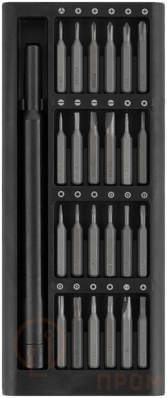 Отвертка с битами для ремонта мелкой электроники FIT HQ позволяет ремонтировать компьютеры, телефоны, часы, очки, фотоаппараты, электротехнику и мелкую электронику. В комплекте 24 биты. Биты обладают высокоточной геометрией и позволяют работать даже с самыми мелкими крепежными элементами. Маркировка способствуют быстрой идентификации бит. Пескоструйная обработка защищает биты от коррозии. Рукоятка обработана анодным окислением, также предотвращающим коррозию. Встроенный в рукоятку магнит прочно удерживает биту. Алюминиевый кейс защищен от коррозии с помощью текстурной пескоструйной обработки и имеет противоскользящие свойства. Кейс быстро открывается с помощью встроенной кнопки.