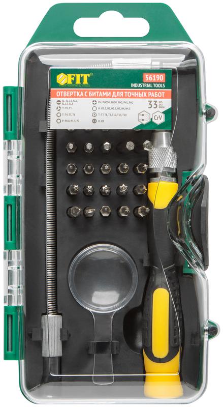 Отвертка с битами для точных работ 30 CrV бит гибкий переходник 190мм лупа пластиковый бокс FIT 56190