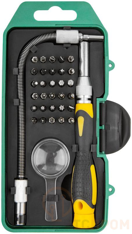 Отвертка FIT с битами для точных работ – это универсальный набор инструментов, предназначенный для ремонта электроники, бытовой техники, компьютеров и других устройств, где требуется высокая точность и аккуратность. Набор включает 30 бит из хромованадиевой стали CrV с разными типами шлицев и размерами, что позволяет выполнять различные работы по ремонту мелких деталей. Гибкий переходник длиной 190 мм позволяет работать в труднодоступных местах. Встроенная лупа облегчает работу с мельчайшими деталями. Пластиковый футляр обеспечивает удобное хранение и транспортировку набора.
