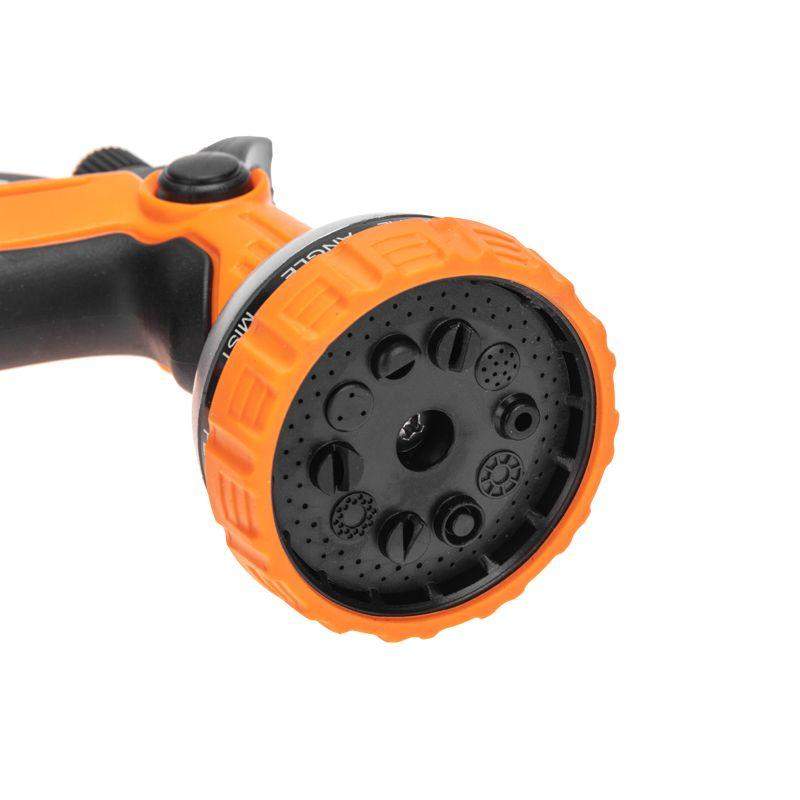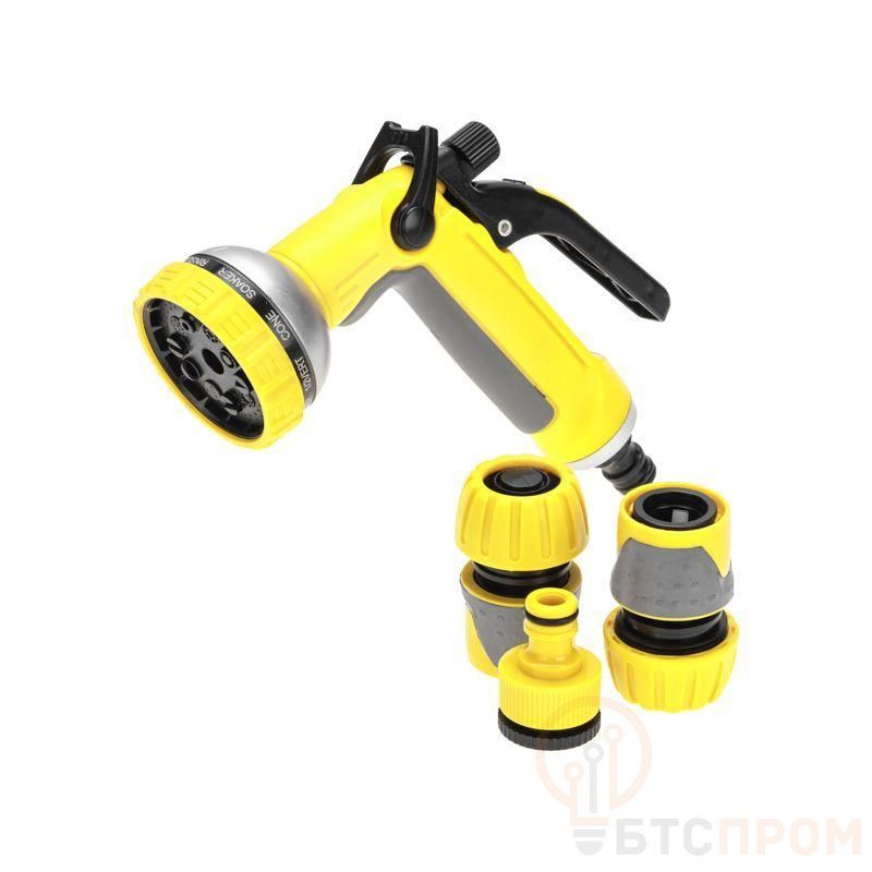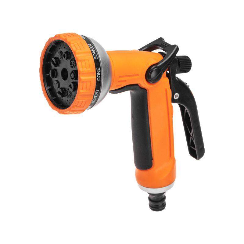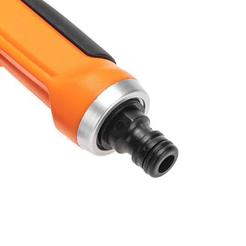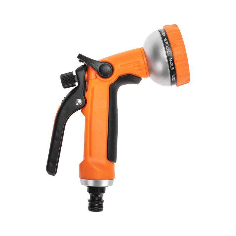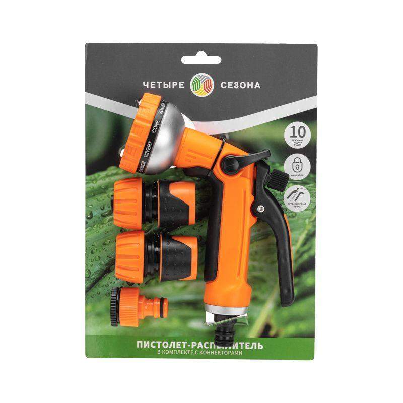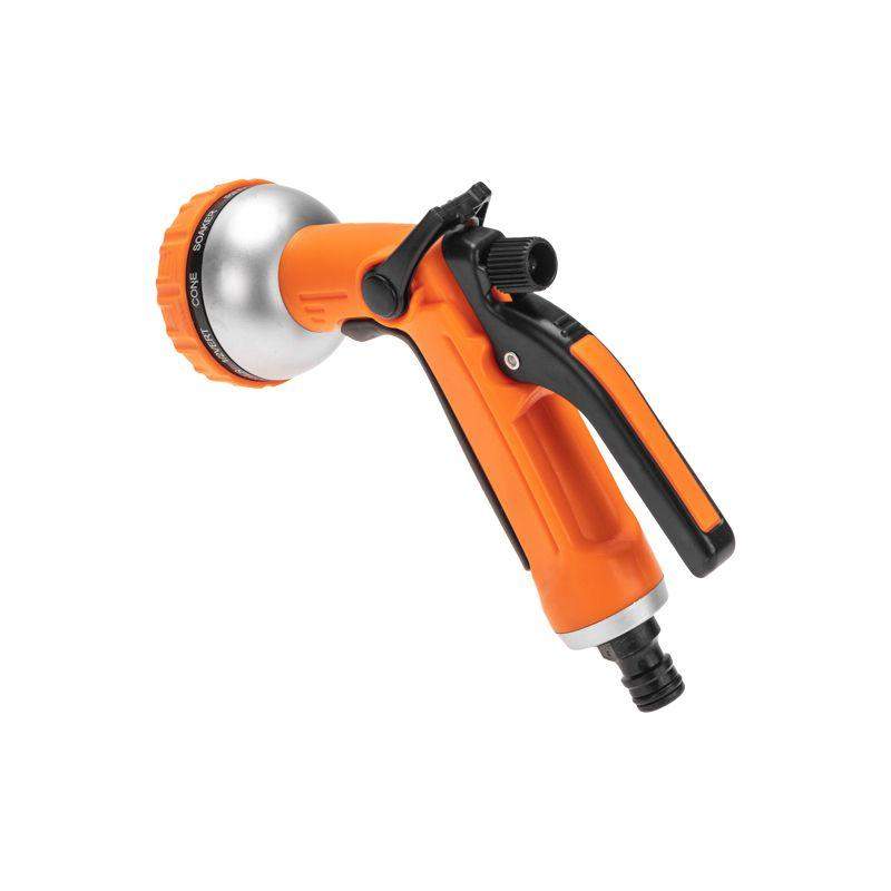 Пистолет-распылитель представляет собой садовый аксессуар, предназначенный для полива растений и почвы. Выполнен из качественного и прочного пластика, устойчивого к воздействию внешних факторов. Устройство оснащено эргономичной ручкой, благодаря которой пистолет удобно и комфортно держать в руке. Имеет 10 режимов подачи воды, регулируемых поворотной головкой. На пистолете предусмотрен фиксатор, позволяющий зафиксировать курок и не зажимать его пальцами в процессе полива. Изделие надежно и герметично крепится к шлангу при помощи универсального соединителя, расположенного на конце пистолета. Комплектуется двумя коннекторами. Используемые материалы: ABS-пластик, полипропилен и термопластичная резина.