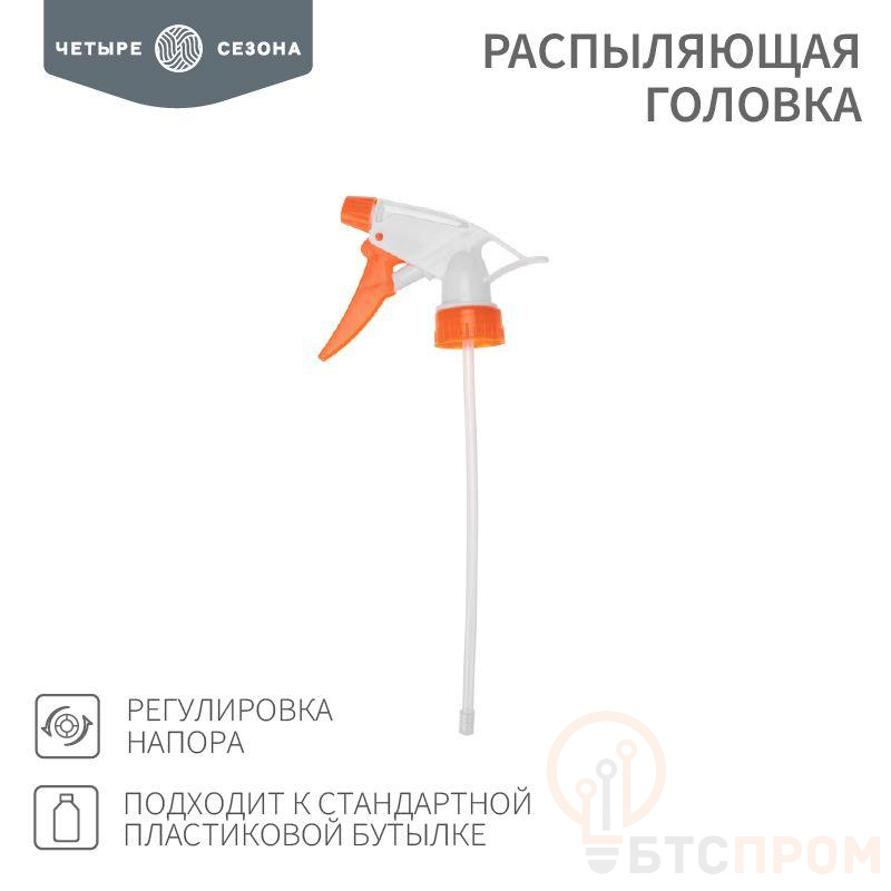 Распыляющая головка представляет собой устройство, применяемое для опрыскивания растений. Изделие также позволяет с удобством наносить моющие средства на различные поверхности и увлажнять помещения. Распыляющая головка просто и быстро устанавливается на стандартную бутылку: накручивается вместо пробки. Оснащена регулятором напора и эргономичным курком. Выполнена из качественного и прочного пластика, устойчивого к воздействию внешних факторов. Материал: полипропилен.