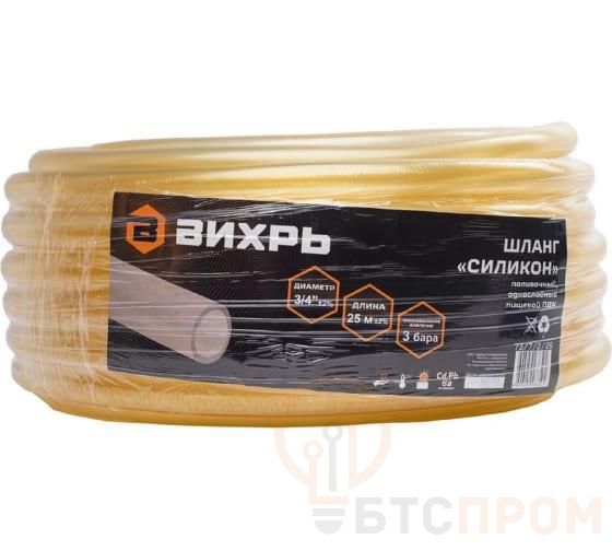 "Поливочный однослойный шланг Вихрь Силикон 3/4"", 25 м, прозрачный 73/7/2/29 предназначен для орошения почвы на садовых и парковых участках. Шланг устойчив к воздействию УФ-излучения и не подвержен гниению."