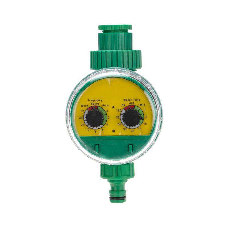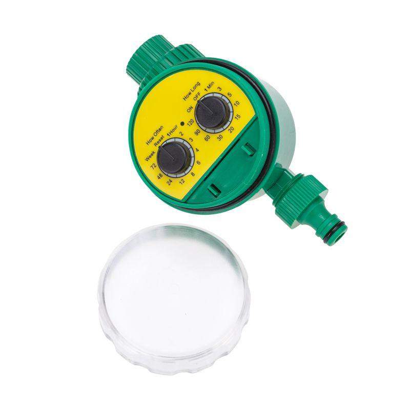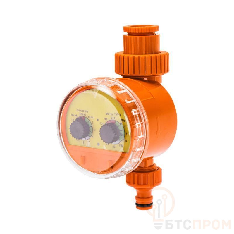 Электронный таймер представляет собой изделие, применяемое при организации систем полива. Предназначен для автоматического полива растений и почвы по заданному времени. На корпусе устройства располагаются два переключателя, которые позволяют выставить интервал полива от 1 до 72 часов и его продолжительность от 1 до 120 минут. Внутри таймера расположен мембранный клапан, регулирующий подачу воды. Допустимое давление от 0.6 до 6.8 атмосфер. Питание таймера осуществляется от двух батареек типа ААА (не входят в комплект). Устройство выполнено из качественного и прочного ABS-пластика, устойчивого к воздействию внешних факторов.