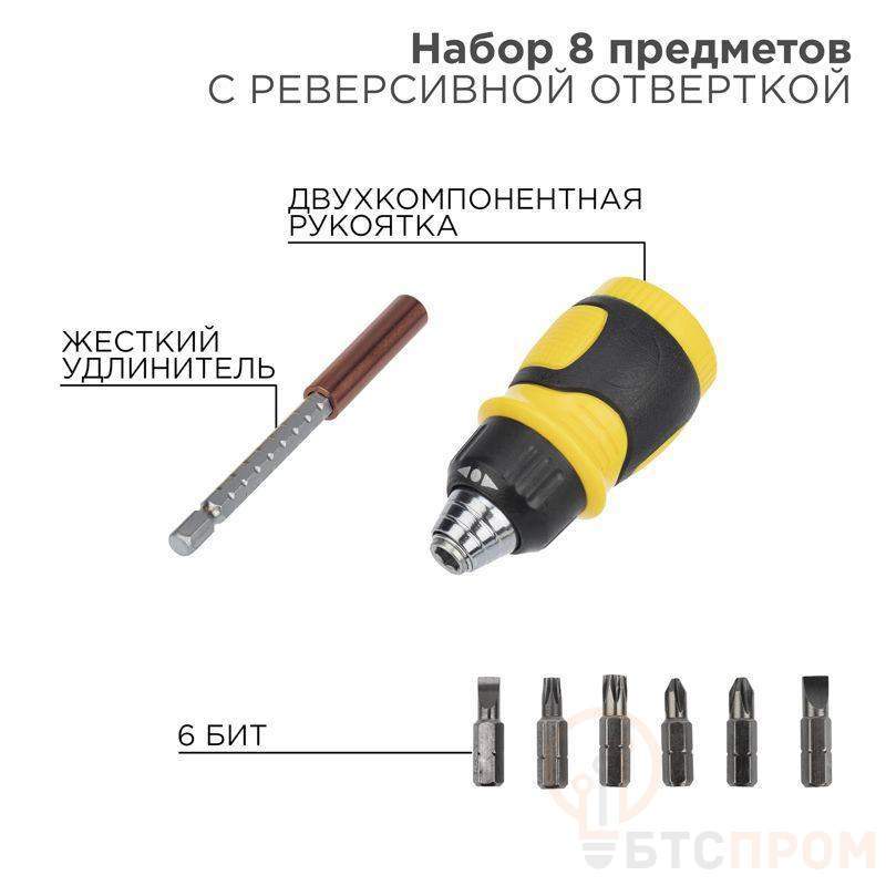 Набор бит с реверсивной отверткой REXANT 8 в 1 применяется для монтажа и демонтажа винтов, шурупов, саморезов и других крепежных изделий. Намагниченные насадки выполнены из качественной хромованадиевой стали. Двухкомпонентная прорезиненная рукоятка не скользит в ладони и обеспечивает дополнительный комфорт при работе. В основании отвертки предусмотрен бокс для хранения насадок. Реверсивный механизм срабатывает как по часовой стрелке, так и против часовой стрелки, а также имеет фиксацию положения. В наборе поставляются биты: T3.0, T2.5, SL6, SL5,PH1, PH2.