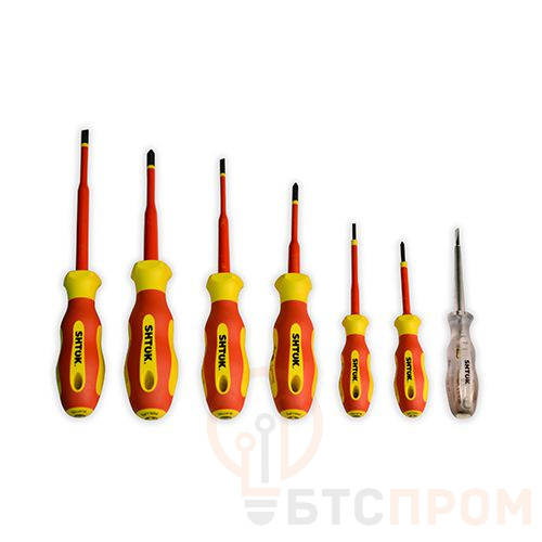 Набор диэлектрических отверток SHTOK 09330 (6+1) — профессиональный инструмент для безопасной работы с электрооборудованием под напряжением до 1000 В. Комплект включает шесть шлицевых и крестовых отверток популярных размеров и удобную переходную бит-удлинитель.