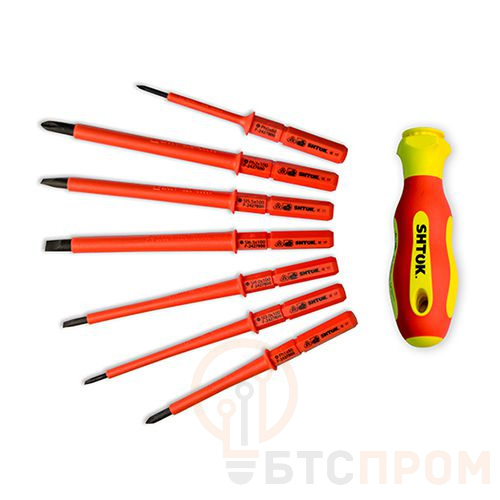 Набор диэлектрических отверток SHTOK 09345 (7+1) — профессиональный инструмент для безопасной работы с электрооборудованием под напряжением до 1000 В. Комплект включает 7 отверток с различными насадками (шлиц, крест, звездочка) и удобную переходную биту-удлинитель.