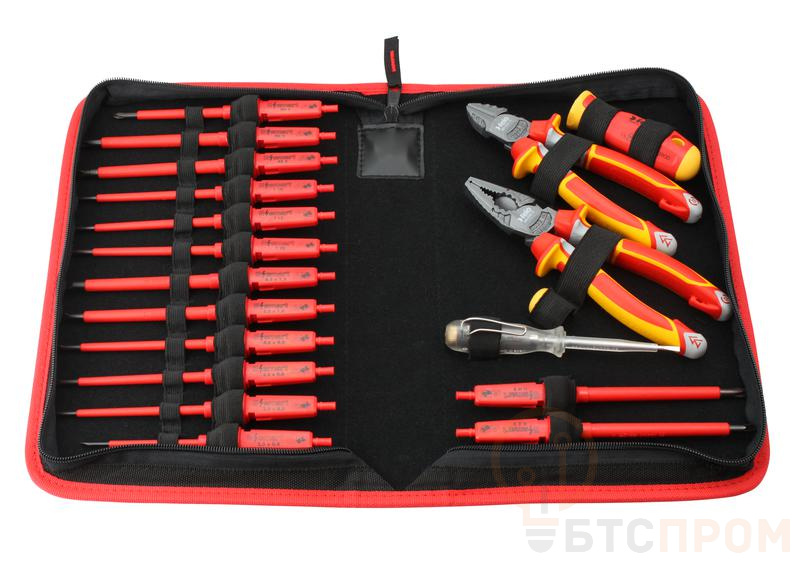 Набор инструментов E-SMART содержит всё необходимое для электро-монтажных работ при напряжении до 1000 В. Двухкомпонентная рукоятка E-SMART оснащена механизмом быстрого отсоединения сменных стержней с защитой от случайного их извлечения и вставным вращающимся колпачком для точных работ с особо чувствительными устройствами. Рукоятка имеет уровень безопасности в соответствии со стандартами DIN EN 60900, который требует, чтобы каждый инструмент проходил индивидуальное тестирование при напряжении 10.000 Вольт. Состав набора: Стержни 2,5x0,4 / 3,0x0,5 / 3,5x0,6 / 4,0x0,8 / 5,5x1,0 / 6,5x1,2 / PH 1 / PH 2 / PZ 2 / Tx 10 / Tx 15 / Tx 20 / plus/minus H 2 / plus/minus Z 2; Рукоятка E-SMART 95х32 мм; Прецизионный колпачок; Пассатижи VDE 180 мм; Бокорезы VDE 160 мм; VDE Отвертка-тестер сети 150-250 В 3,0х70мм; Сумка 310х190х70мм.