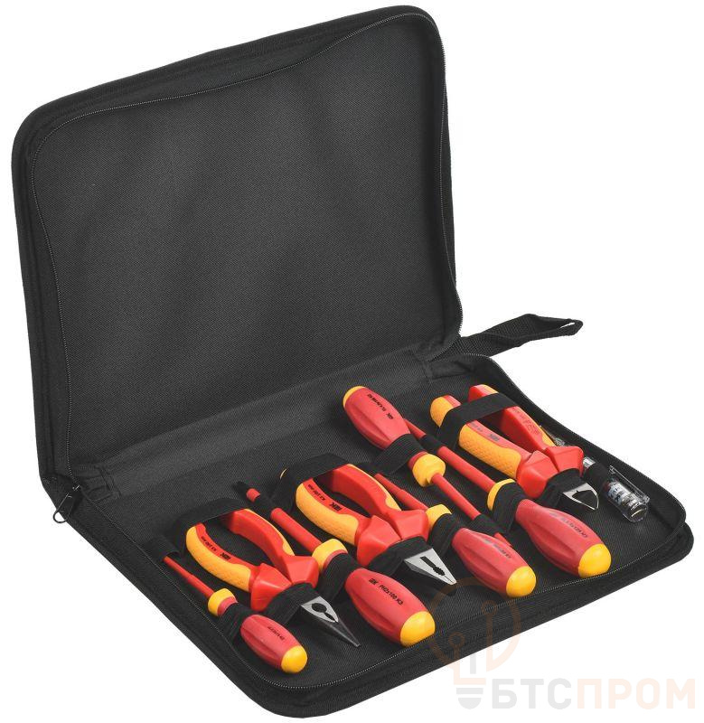 Набор диэлектрического инструмента N-01 серии К3 (Expert) рассчитан на использование под напряжением до 1000 В. Комплект включает в себя пассатижи 160мм, бокорезы 160мм и тонкогубцы 160мм, крестообразные отвертки PH1х80, PH2х100; шлицевые отвертки SL2,5х75, SL4,0х100, SL5,5х125 и отвертку-пробник ОП-1. Материал рукояток – полипропилен и поливинилхлорид PP+PVC.