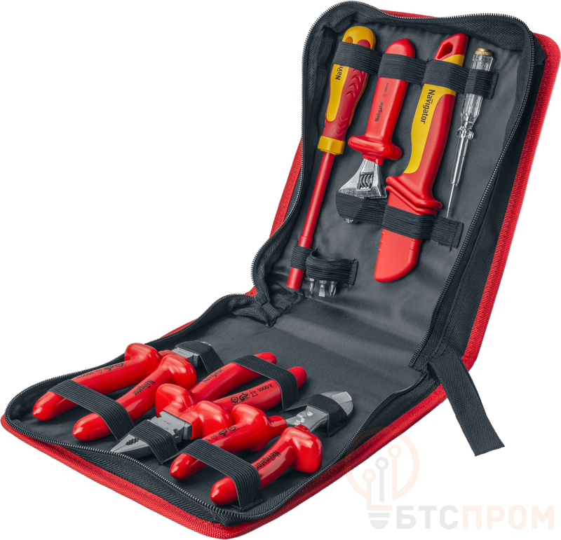 Набор инструмента диэлектрический NHT-Ind06-H12 от NAVIGATOR — это профессиональный комплект из 12 предметов, предназначенный для безопасной работы с электрооборудованием под напряжением до 1000 В. Все инструменты в наборе (отвертки, пассатижи, бокорезы и др.) изготовлены из высококачественной кованой стали и прошли испытания на соответствие строгим стандартам электробезопасности.