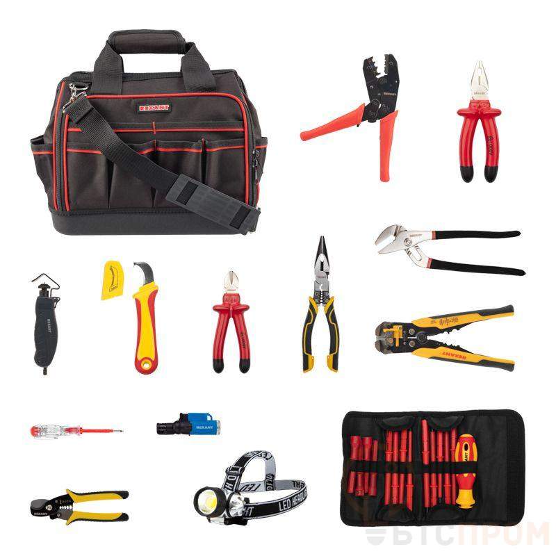 Набор инструментов для электрика REXANT состоит из 21 предмета и позволяет провести весь цикл электромонтажа до 1000В. В наборе собраны инструменты для зачистки кабеля, обжима клемм и безопасного подключения к щиту, а также диэлектрические отвертки с 14 шлицами, которые подойдут к любому оборудованию. Налобный фонарь позволяет комфортно работать в слабоосвещенных местах. Тестер пробник со сменным наконечником удобен и прост в использовании. Сумка изготовлена из водонепроницаемого материала, что обеспечивает надежную защиту инструментов от воздействия влаги и повышает их долговечность. Набор подходит для профессионального использования. Состав набора: Кримпер для обжима изолированных автоклемм 0,5-6,0 мм2 (арт. 12-3014) Кабелерез для кабеля диаметром до 13,5 мм, с функцией зачистки кабеля 0,5-6 мм2 (арт. 12-5412) Инструмент для зачистки кабеля 0,2-6,0 мм2 и обжима наконечников (арт. 12-4005) Инструмент для продольной зачистки кабеля 4,5-25,0 мм2 (арт. 12-4052) Нож монтажника из нержавеющей стали с «пяткой» (арт. 12-4935) Плоскогубцы комбинированные 180 мм, диэлектрические до 1000В (арт. 12-4612-3) Бокорезы 180 мм, диэлектрические до 1000 В (арт. 12-4615-3) Тонкогубцы многофункциональные универсальные 200мм KRANZ (KR-12-4653-5 ) Клещи переставные 250 мм никелированные, обливные рукоятки (арт. 12-4635) Набор диэлектрических отверток 8 предметов (шлицы: PH2-SL6, PH1-SL5, PH0-SL3, Y1-Y2, Т15-Т25, Т10-Т20, U2.6-TR2.3) (арт. 12-4773) Фонарь налобный, трехрежимный, поворотный (арт. 75-701) Тестер-пробник с комбинированным жалом (арт. 12-2042) Турбо горелка заправляемая, красная (арт. 12-0010-2) (Изготовитель: «Нингбо джиа ши трейдинг Ко., ЛТД» / «Ningbo jia she trading Co. Ltd» 5-5, билдинг 009, Шубо роад No 9, Иньчжоу дистрикт, Нингбо сити, Чжецзян провинц, Китай/ 5-5, bulding 009, Shubo road no 9, Yinzhou district, Ningbo city, Zhejiang province, China) Сумка монтажника из прочного полиэстера 600D (арт. 12-5617)