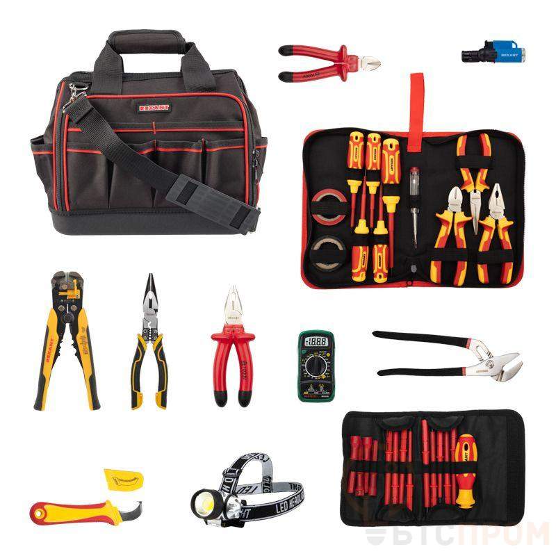 Набор инструментов электрика REXANT состоит из 29 предметов и позволяет провести весь цикл электромонтажа до 1000В. Диэлектрический набор имеет все необходимые инструменты для работы с напряжением до 1000В. В наборе собраны инструменты для зачистки кабеля, обжима клемм и безопасного подключения к щиту, а также диэлектрические отвертки с 14 шлицами, которые подойдут к любому оборудованию. Мультиметр обладает широким функционалом с функцией DATA HOLD и имеет подсветку. Налобный фонарь позволяет комфортно работать в слабоосвещённых местах. Тестер пробник со сменным наконечником удобен и прост в использовании. Сумка изготовлена из водонепроницаемого материала, что обеспечивает надежную защиту инструментов от воздействия влаги и повышает их долговечность. Набор подходит для профессионального использования. Состав набора: Набор диэлектрических инструментов, 11 предметов, до 1000В, в тканевом пенале (арт. 12-4692-3) Инструмент для зачистки кабеля 0,2-6,0 мм2 и обжима наконечников (арт. 12-4005) Нож монтажника из нержавеющей стали с «пяткой» (арт. 12-4935) Клещи переставные 250 мм никелированные, обливные рукоятки (арт. 12-4635) Портативный мультиметр MAS830L в кожухе с прозвонкой и подсветкой (арт. 13-2007) Фонарь налобный, трехрежимный, поворотный (арт. 75-701) Турбо горелка заправляемая, красная (арт. 12-0010-2) Набор диэлектрических отверток 8 предметов (шлицы: PH2-SL6, PH1-SL5, PH0-SL3, Y1-Y2, Т15-Т25, Т10-Т20, U2.6-TR2.3) (арт. 12-4773) Плоскогубцы комбинированные 180 мм, диэлектрические до 1000В (арт. 12-4612-3) Бокорезы 180 мм, диэлектрические до 1000В (арт. 12-4615-3) Плоскогубцы профессиональные многофункциональные 200 мм (арт. KR-12-4655-5) Сумка монтажника из прочного полиэстера 600D (арт. 12-5617)