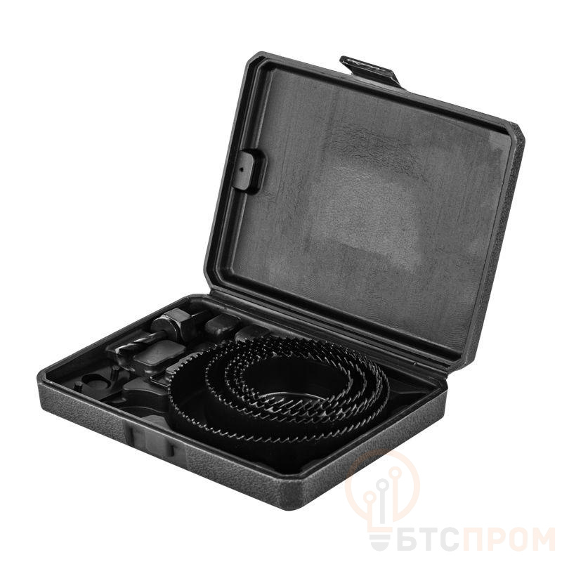Набор кольцевых пил предназначен для сверления древесины, ДСП, ДВП и пластика. Пилы применяются совместно с дрелью, станком или шуруповертом. Изготовлены из углеродистой стали, устойчивой к повреждениям, поэтому подходят для длительного использования. Зубья пил разведены, что облегчает удаление стружки и увеличивает скорость сверления. Сверление необходимо осуществлять в безударном режиме с применением СОЖ. В комплект входит центрирующее сверло, упрощающее центровку пилы, что позволяет получать отверстия правильной формы. Также в наборе предусмотрен шестигранный ключ 2,5 мм, позволяющий надежно зафиксировать сверло в державке. Соединительная резьба, дюйм: 1/2" 5/8". Набор поставляется в удобном пластиковом кейсе с ложементами, что облегчает его хранение и транспортировку. В комплектацию входят: пилы размером 64, 76, 89, 102, 127 мм - 5 шт; хвостовики шестигранные 9,5 мм и 11 мм – 2 шт; шестигранный ключ 2,5 мм; центрирующее сверло.