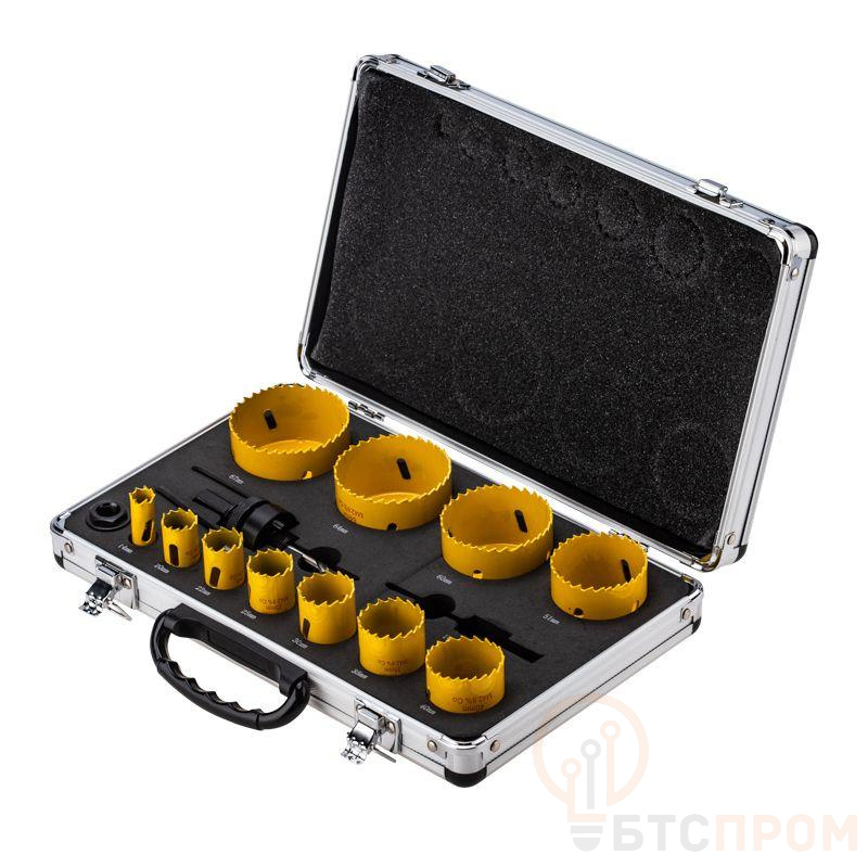 Набор биметаллических коронок KRANZ используется во время строительных и ремонтных работ. Подходит для сверления в безударном режиме дерева, стали, металла, гипсокартона и пластика совместно с дрелями, перфораторами и стационарными станками. Коронки, входящие в состав набора, выполнены из инструментальной стали, а зубья с переменным шагом 4-6 мм изготовлены из быстрорежущей стали Р6М5К8 с добавлением 8% кобальта, что обеспечивает стойкость к перегреву. В боковой стенке коронок предусмотрено отверстие, которое компенсирует деформации при перегреве, отводит строительную пыль и шлам. Особая заточка зубьев способствует эффективному входу в материал, что позволяет вырезать отверстия правильной круглой формы без сколов и трещин. Сверление металла/стали необходимо осуществлять с применением смазочно-охлаждающей жидкости. Набор поставляется в металлическим кейсе. В комплектацию входят 16 предметов: 6 коронок диаметром 14, 20, 22, 25, 30, 35, 40, 51, 60, 64, 67 мм , 2 хвостовика для коронок, 2 шестигранных ключа, 1 адаптер.
