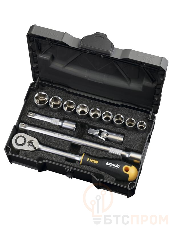 Набор инструмента и оснастки Felo предназначен для авторемонтных работ. Набор Felo содержит 9 торцевых метрических головок 1/2", 3 переходника (адаптер) на головки и трещотку 1/2" ERGONIC. Вся оснастка Felo изготовлена из высококачественной инструментальной стали (CrMoV), закаленной в масле, обеспечивающей повышенный рабочий ресурс. Инструмент поставляется в компактном ударопрочном пластиковом кейсе. Набор Felo подходят для ежедневного профессионального использования. Страна производства - Германия. Состав набора: Головки, мм: 13, 14, 15, 16, 17, 18, 19, 21, 22; Удлинитель 1/2"для храповика и вставки торцевого ключа 100 мм; Удлинитель 1/2"для храповика и торцевых гаечных ключей 250 мм; Переходник поворотный на квадрат 1/2"; Трещотка ERGONIC 1/2"; Ударопрочный пластиковый кейс