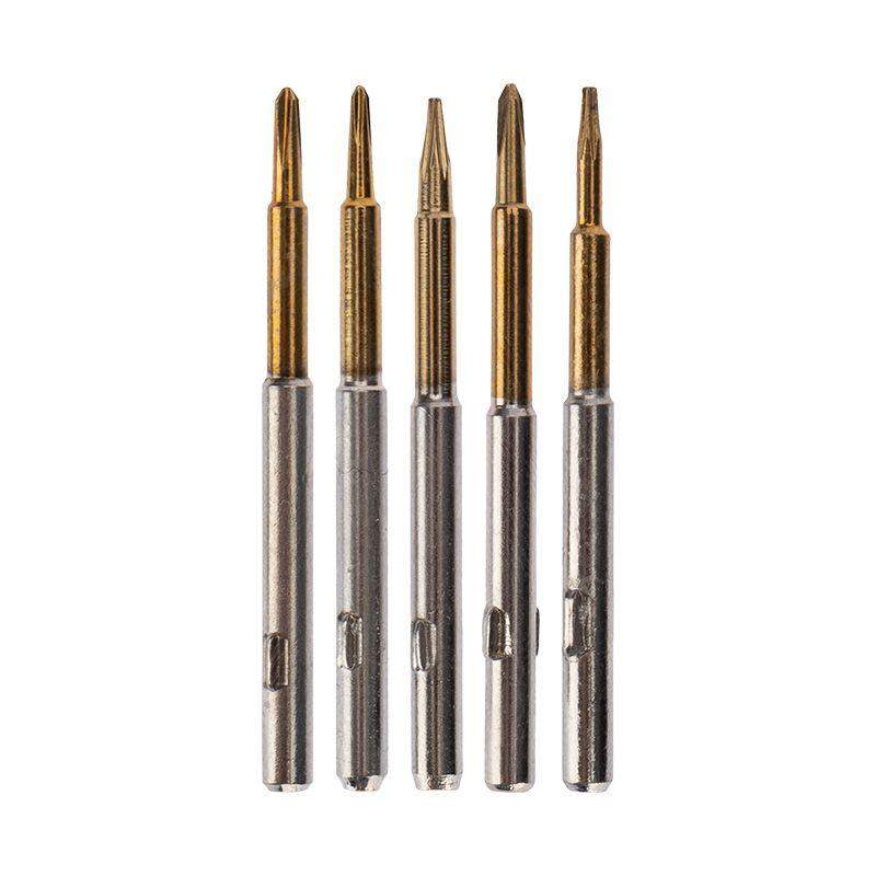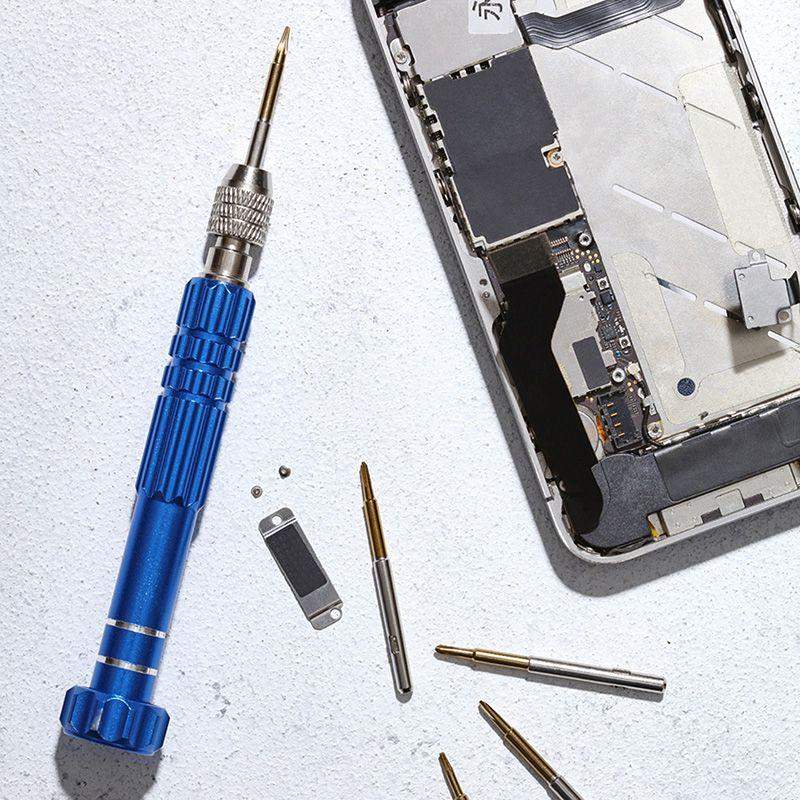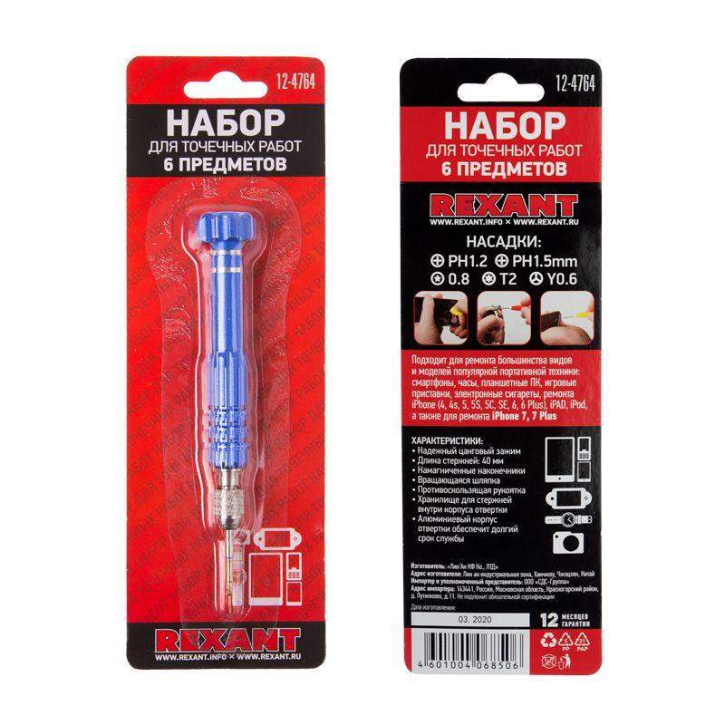 Набор отверток REXANT 6 в 1 оптимален для выполнения прецизионных работ в электронике и электромеханике, ремонта большинства видов и моделей популярной портативной техники: смартфонов, часов, планшетных ПК, игровых приставок, фотокамер, электронных сигарет. Комплект пригодится для ремонта техники Apple. Инструменты выполнены из качественной стали, обладающей высокой прочностью к механическим повреждениям и образованию ржавчины. Отвертка эргономичной формы обладает противоскользящей рукояткой и вращающейся шляпкой, которая позволяет упереть основание отвертки в ладонь и производить прокручивание инструмента только пальцами без постоянного перемещения руки. Цанговый зажим обеспечивает быструю замену и надежную фиксацию насадок. Внутри корпуса отвертки предусмотрено хранилище для насадок. Характеристики: TORX (шестигранная звезда): T2 PHILLIPS (крестовая): PH1.2, PH1.5 Pentalobe (шлиц для продукции Apple): 0.8 Tri-Wing (трехлистник для iPhone7, 7 plus, Apple Watch): Y0.6 Отвертка: да Посадка бит: 1/8 Материал насадок: хромованадиевая сталь Материал рукоятки: алюминий