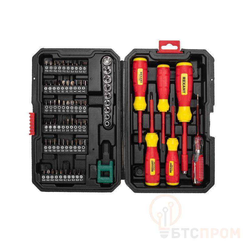 Набор отверток REXANT предназначен для электромонтажных работ, монтажа/демонтажа крепежных соединений: шурупов, саморезов и т. д. Диэлектрические стержни отверток и биты, изготовленные из высококачественной хромованадиевой стали, покрыты специальным изоляционным материалом и обладают оксидированными намагниченными наконечниками. Корпус эргономичной изолированной рукоятки выполнен из пластика, не скользит в ладони, что обеспечивает дополнительный комфорт при работе. Набор поставляется в пластиковом боксе для удобства хранения и транспортировки. Материал стержней – хромованадиевая сталь. Материал рукоятки – ABS-пластик. Материал бокса – ABS-пластик. Набор состоит из 76 предметов. Биты: крестовые: РН0х2, РН1х2, РН2х2, PH3x4, PZ1, PZ2, PZ3; U-образные: U6, U8, U10, U12; шестигранные: Н2,5, НЗ, Н4, Н5, Н6; квадратные: SQ1, SQ2, SQ3; tri-wing (трехлистник): Y1, Y2, Y3, Y4; DR: #1, #2, #3; треугольник: 2,3, 2,6, 3,0; X: 6, 8,10; шлицевые: SL3x2, SL4x2, SL5x2, SL6x2, SL7x2; шестигранная звезда (с отверстием): Т8Н, Т10Н, Т15Н, Т20Н, Т25Н, Т27Н, ТЗОН, Т35Н, Т40Н; головки мини: М5, М6; головки: М5, М6, М7, М8, М9, М10, М11, М12, М13; отвертки: РН0х75, РН1х75, SL3х75, PH/SL2х75; отвертка под биты; переходник; тестер-отвертка, намагничиватель.
