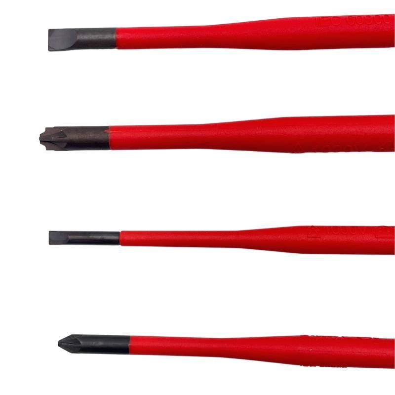 Отвертки диэлектрические Felo серии E-Slim предназначены для проведения электромонтажных работ с крепежом типа SL и комбинированного типа plus/minus Z1, Z 2 в установках и электрощитах под напряжением до 1000 Вольт. Серия E-Slim отличается от обычных отверток более тонкой и удлиненной рукояткой (на 30% тоньше и на 20% длиннее) и утонченной изоляцией стержня (на 50% тоньше), что обеспечивает безопасное рабочее расстояние и лучший обзор. Гладкая бесшовная ручка с мягким внешним покрытием имеет улучшенную эргономику, так как выполнена по запатентованной технологии Felo ERGONIC - единственная в мире ручка, которая адаптируется к руке пользователя, обеспечивает превосходную эргономику, передачу крутящего момента и комфорт при работе. Стержень изготовлен из высококачественной инструментальной стали (CrMoV) дополнительно закаленной в масле и проходит по всей длине рукоятки. Все отвертки сертифицированы в соответствии с DIN EN 60900, который требует, чтобы каждый отдельный инструмент был протестирован под напряжением 10.000 Вольт. Состав набора: Отвертки SL 3,5х100 / 5,5х125; +/- Z 1x80 / +/- Z 2x100.