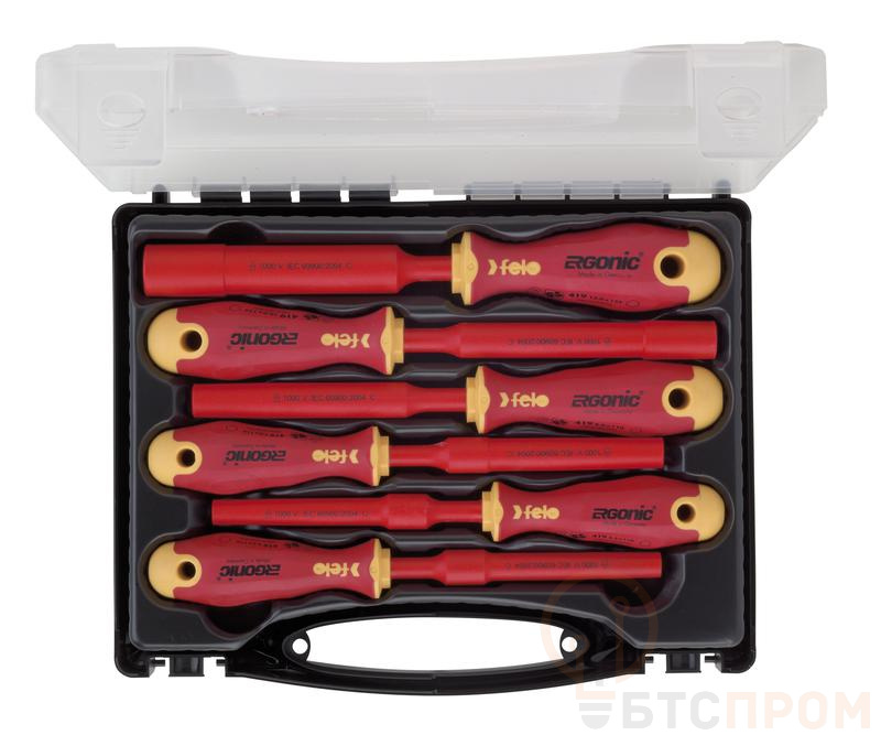 Felo Набор отверток диэлектрических M-TECH Ergonic в кейсе предназначены для работ с крепежом, в.том числе с напряжением до 1000 В. Состав наборы: серия 419: 5,5x110 / 6,0x110/ 7,0x110 / 8,0x110 / 10,0x125 / 13,0x125.