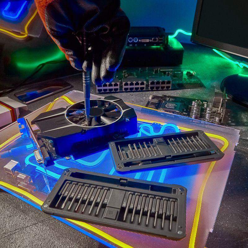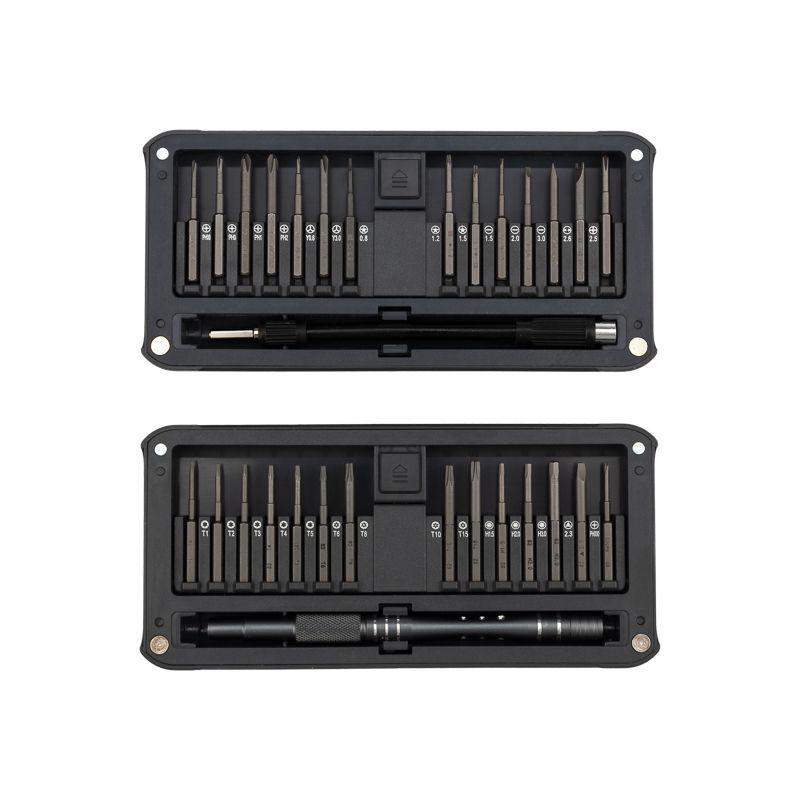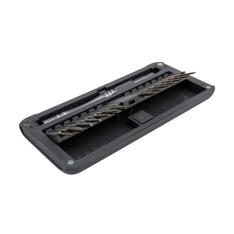 Набор отверток для точных работ KRANZ RA-02 оптимально подходит для ремонта телефонов, компьютеров, приемников и многих других популярных приборов, которые используются в быту. Инструменты набора изготовлены из качественной японской стали S2, обладающей высокой прочностью к механическим повреждениям. Точно подобранные по характеристикам магнитные насадки отлично подходят для профессионального ремонта и для мелких бытовых работ. Компактный кейс удобен в транспортировке и с легкостью открывается одной рукой. В наборе отвертка с 28 битами: 1.5, 2.0, 3.0, PH0, PH1, PH2, PH00, PH000, T1, T2, T3, T4, T5, TR6, TR8, TR10, TR15, H1.5, H2.0, H3.0, P2, P5, P6, U2.6, Y0.7, Y3, Triangle 2.3, Special PH2.5. Посадка бит: 1/8