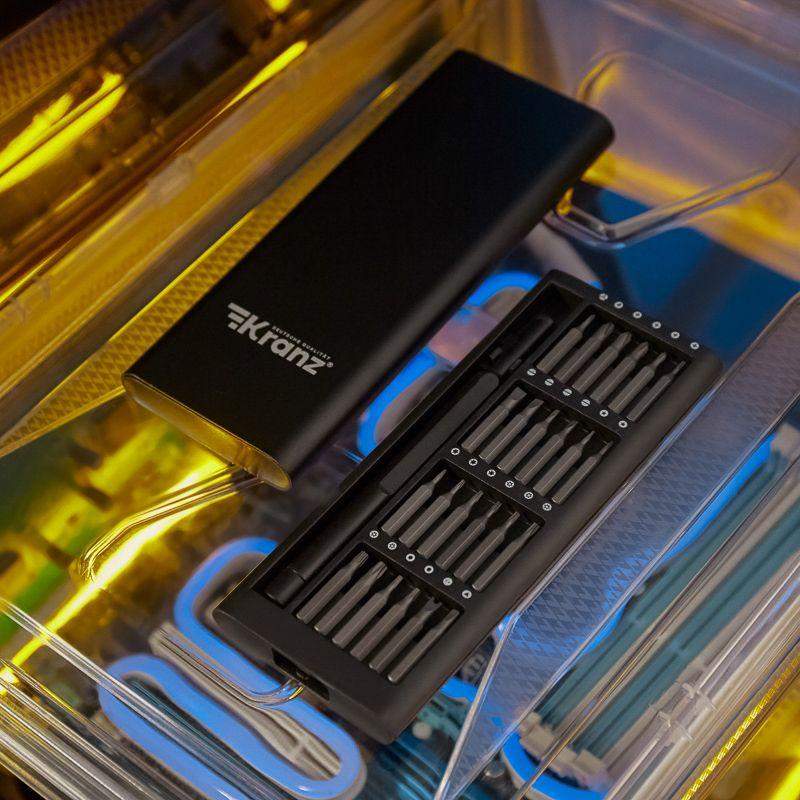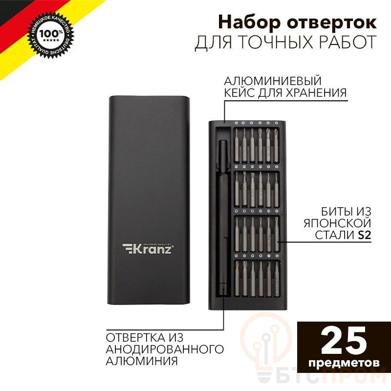 Набор отверток для точных работ KRANZ RA-03 отлично подходит для ремонта телефонов, компьютеров, приемников и для многих популярных приборов, которые используются в быту. Инструменты набора изготовлены из качественной японской стали S2, обладающей высокой прочностью к механическим повреждениям. Точно подобранные по характеристикам магнитные насадки отлично подходят для профессионального ремонта и для мелких бытовых работ. Компактный кейс удобен в транспортировке и с легкостью открывается одной рукой. В наборе отвертка с 24 битами: 1.0, 1.5, 2.0, 2.5, 3.0, PH0, PH1, PH00, PH000, PZ0, PZ1, PZ00, T4, T5, T6, T7, T8, T9, T10, T15, H1.5, H2.0, P2, P5. Посадка бит: 1/8