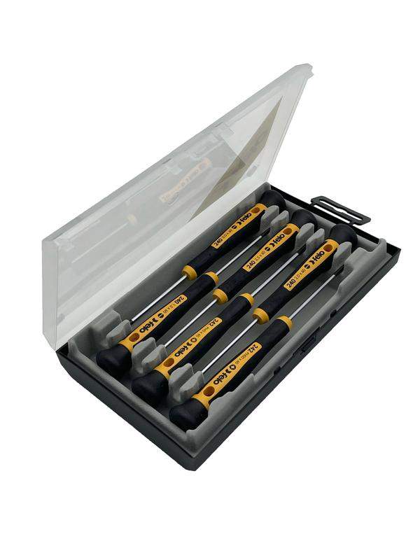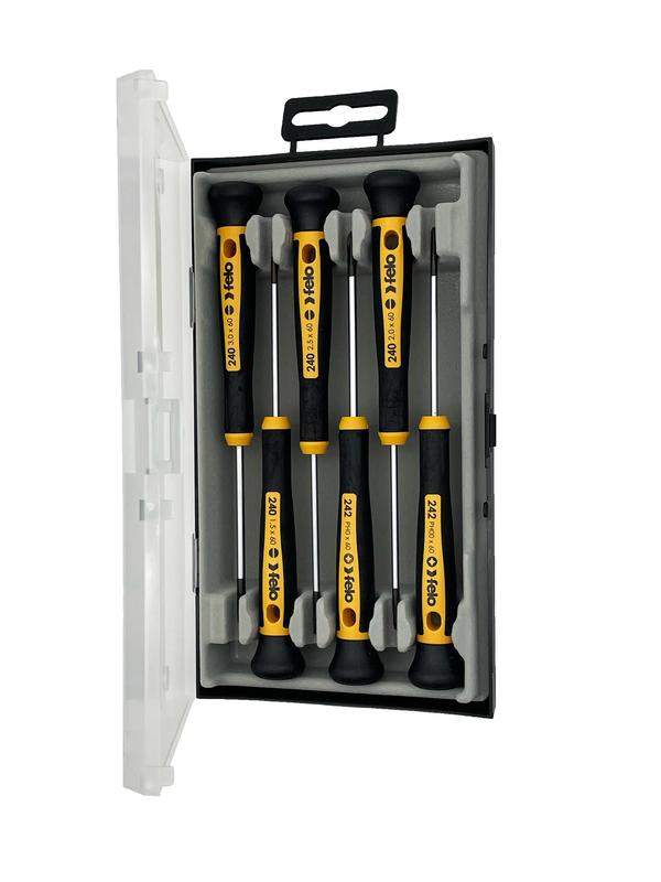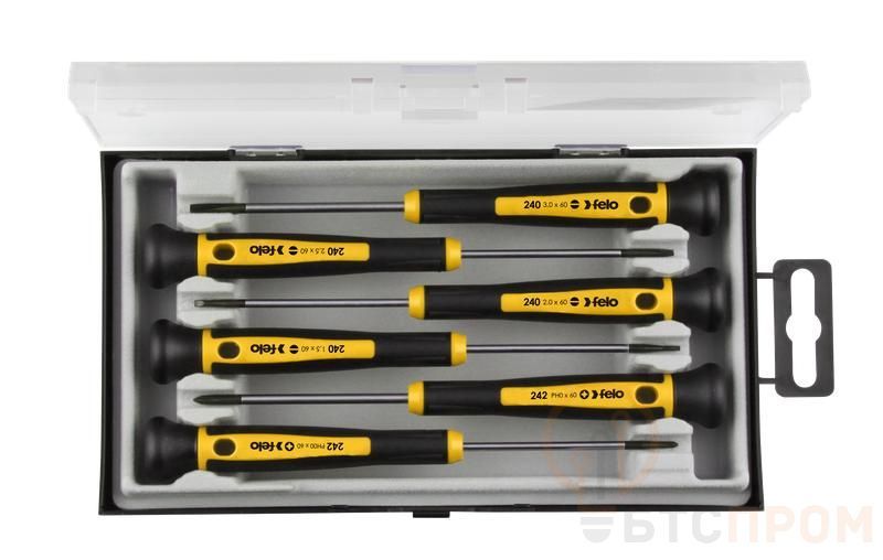 Набор состоит из 6 отвёрток SL и PH в удобном пластиковом кейсе. Отвертки предназначены для точных работ с крепежом благодаря поворотному намагниченному наконечнику. Стержень изготовлен из хромованадиевой стали, что гарантирует долговечность. Надёжный захват в руке пользователя обеспечивает двухкомпонентная рукоятка. Состав набора: 4хSL 1,5х60 / 2,0х60 / 2,5х60 / 3,0х60; 2хРН 00х60 /0х60; Пластиковый кейс.