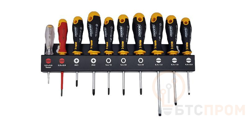 Набор состоит из восьми отверток Ergonic, диэлектрической отвертки и отвертки-тестера напряжения. Применяются они для работы с резьбовыми соединенияи и различного рода крепежом. Наличие в комплекте диэлектрической отвёртки позволяет работать под напряжением. Инструменты обладают высокой прочностью, рукоятки эргономичной формы приспосабливается под руку любого пользователя.