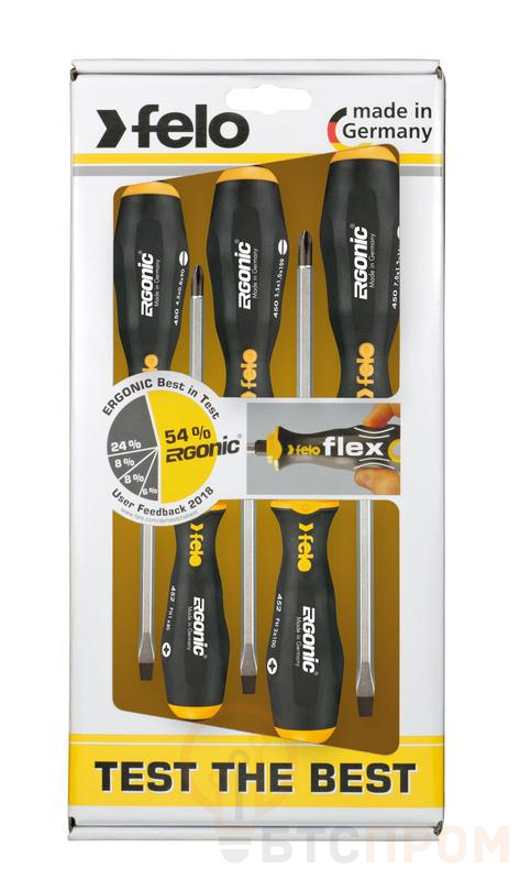 Набор ударные отверток с рукояткой Ergonic. Ударная отвертка Ergonic имеет трехкомпонентную рукоятку и стальную шляпку. Её стержень проходит по всей длине изделия. Отвёртка содержит шестигранную гайку под ключ для дополнительного усилия пользователем. Мягкий, противоскользящий материал рукоятки помогает обеспечить наибольшую передачу усилия. Подобный дизайн рукоятки не позволяет инструменту скатываться с поверхности. Стержень отвертки изготовлен из хром-молибден-ванадиевой закалённой стали. Тип наконечника для простоты подбора имеется на верхней части рукоятки. Состав набора: SL 4,5x90 / 5,5x100 / 7,0x130 PH 1x80 / 2x100