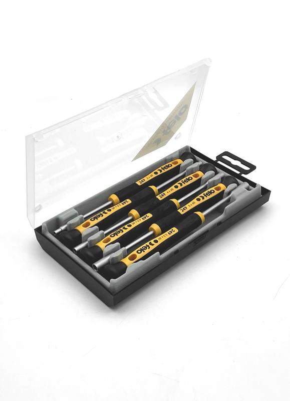 Набор отверток-торцевых ключей для точных работ с очень точным жалом предназначен для микроскопических и точных работ с мелким крепежом в небольших устройствах таких, как часы, сотовые телефоны, фотокамеры и карманные ПК, ноутбуки, планшеты, игровые приставки и иные виды бытовой техники. Закаленный по всей длине стержень из высоколегированной инструментальной стали устойчив к повреждениям. Двухкомпонентная ручка с комфортным внешним покрытием обеспечивает комфорт при работе и имеет антистатическое покрытие. Свободно вращающийся колпачок также предотвращает натирание ладони. Состав набора: 3,0x60 / 3,5x60 / 4,0x 60 / 4,5x60 / 5,0x60 / 5,5x60.