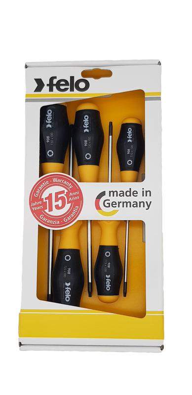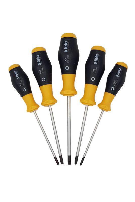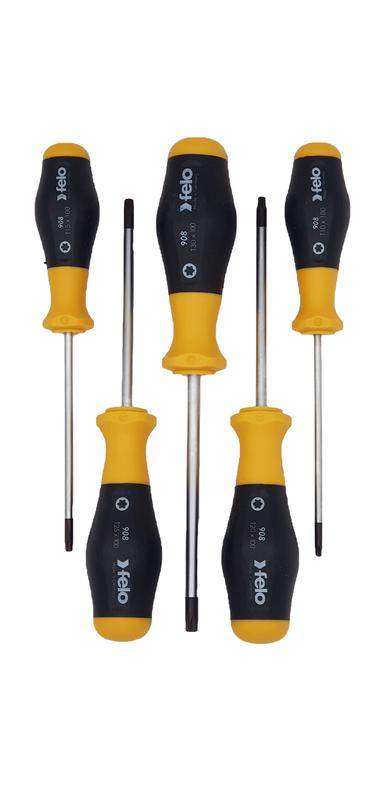 Набор отверток 900-ой серии. Эргономичный дизайн рукоятки и противоскользящий материал (Soft Grip) помогает обеспечить наибольшую передачу усилия. Специальный дизайн двухкопонентной рукоятки не позволяет инструменту скатываться с поверхности. Лезвия изготовлены из специальной хромомолибден-ванадиевой стали для достижения наилучшего результата при работе! Точная посадка в крепеж обеспечивается за счет черного наконечника (Black-Tip). Состав набора: TX 10 / 15 / 20 / 25 / 30