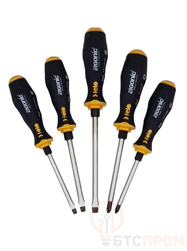 Ударная отвертка используется при затруднительном выкручивании крепежных изделий, когда невозможно справиться обычными инструментами. Ударопрочный стержень проходит по всей длине отвертки и изготовлен из закаленной высококачественной инструментальной стали (CrMoV), закаленной дополнительно в масле, износостойкость и прочность которой превышает технические требования европейских стандартов DIN и ISO. На стержне имеется приваренная шестигранная гайка для придания дополнительного усилия на крепеж при откручивании/закручивании винтов. Рукоятка ERGONIC - первая в мире бесшовная рукоятка, которая адаптируется под руку любого пользователя, снижает нагрузку и утомляемость, а также увеличивает комфорт и максимальный крутящий момент. Продуманный дизайн рукоятки не позволяет инструменту скатываться с поверхности. Внешнее покрытие рукоятки имеет высокую устойчивость к царапинам и ГСМ. На верхней части рукоятки находится ударный колпачок. Отвертки Felo подходят для ежедневного профессионального использования. Состав набора: SL 5,5x100 / 7,0x130 / 8,0х150 / PH 2x100 / РН3х150.