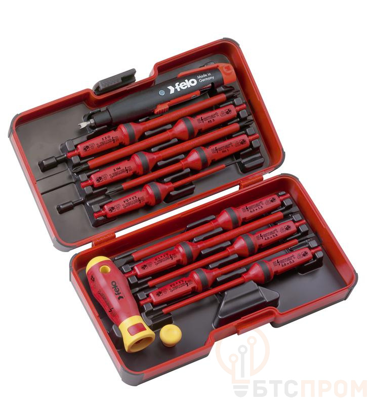 Набор инструментов для монтажных работ E-SMART оснащен рукояткой и набором сменных диэлектрических стержней, универсальным ключом для ящиков, а также специальным прецизионным колпачком для использования стержней для точных работ. Стержни имеют изоляцию на 50% тоньше, благодаря чему стало удобнее работать с глубоко посаженными винтами. Все отвертки сертифицированы DIN EN 60900, требующего, чтобы каждый отдельный стержень был испытан при 10.000 Вольт. Состав набора: Стержни 2,5x0,4 / 3,0x0,5 / 3,5x0,6 / 4,0x0,8 / 5,5x1,0 / 6,5x1,2 / PH 1 / PH 2 / PZ 2 / Z 2, Spanner 10 x 25; Рукоятка Felo E-SMART 95х32 мм; Прецизионный колпачок; Универсальный ключ д/ящиков; Прочный кейс 230х30х56 мм.