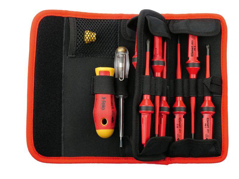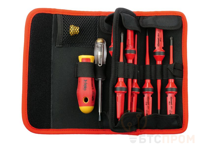 Набор инструментов E-SMART содержит всё необходимое для электро-монтажных работ при напряжении до 1000 В. Двухкомпонентная рукоятка E-SMART оснащена механизмом быстрого отсоединения сменных стержней с защитой от случайного их извлечения и вставным вращающимся колпачком для точных работ с особо чувствительными устройствами. Рукоятка имеет уровень безопасности в соответствии со стандартами DIN EN 60900, который требует, чтобы каждый инструмент проходил индивидуальное тестирование при напряжении 10.000 Вольт. Состав набора: Стержни 2,5x0,4 / 3,0x0,5 / 4,0x0,8 / 5,5x1,0 / PH 1 / PH 2 / PZ 2 / Tx 10 / Tx 15 / Tx 20; Рукоятка E-SMART 102х32 мм; Отвертка-тестер сети 3,0х0,8х70 150-250 Вольт; Прецизионный колпачок; Сумка для ремня, нейлоновая.
