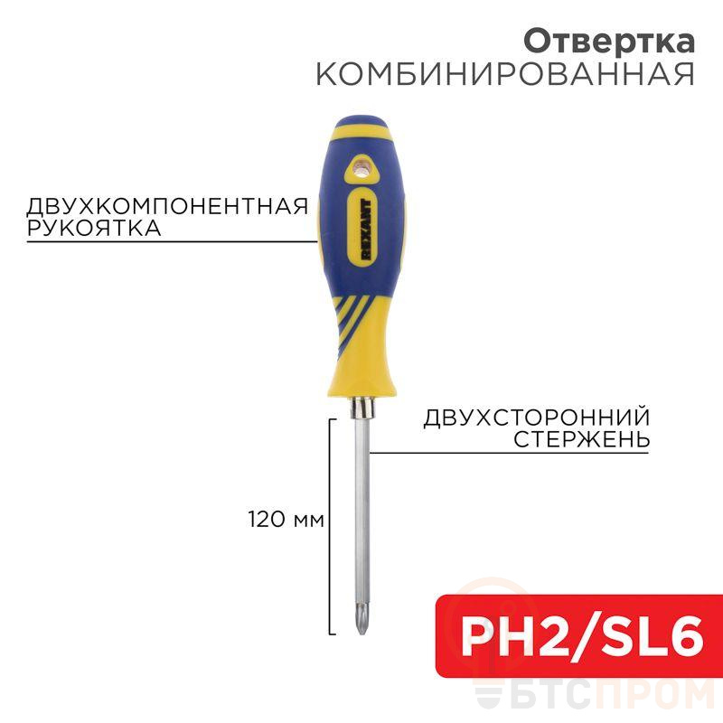 Отвертка комбинированная двухсторонний стержень 120мм(крестовая PH2 шлицевая SL 6мм) двухкомпонентн. рукоятка Rexant 12-4741