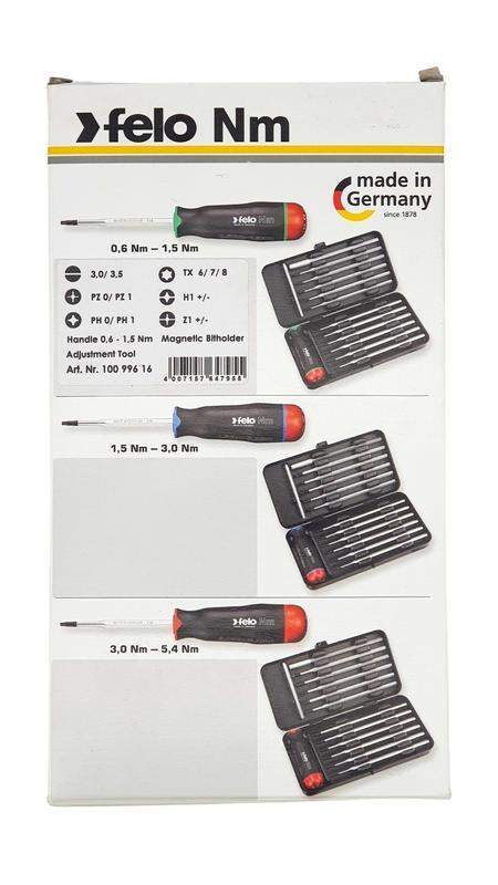 Динамометрическая рукоятка Felo серии Nm с набором сменных стержней предназначена для сборки ответственных электротехнических соединений, с заданным значением крутящего момента силы. Рукоятка имеет диапазон затягивания от 0.6 до 1.5 Нм (с шагом в 0,1 Нм). Гладкая бесшовная рукоятка имеет усовершенствованную эргономичную форму, удобно ложится в руку, не проскальзывает и снижает утомляемость. Каждая рукоятка индивидуально откалибрована и сертифицирована. С рукояткой применяются сменные стержни длиной 170мм, изготовленные из закаленной в масле хром-молибден-ванадиевой стали, износостойкость которой превышает технические требования DIN и ISO. Важно: нагружать отвертку следует равномерно, плавно и по часовой стрелке. Достижение заданного момента затяжки сопровождается щелком. Как только заданный момент затяжки достигнут, необходимо прекратить дальнейшую нагрузку на отвертку. Механизм блокируется при вращении против часовой стрелки (на ослабление винтов).<br /> Если стрелка переместилась за пределы шкалы повернув регулировочный ключ по часовой стрелке повторно выровняйте шкалу и стрелку. Cменные стержни: SL 3.0x0.5 / 3.5x0.6 / PZ0 / PZ1 / PH0 / PH1 / Torx 6 / Torx 7 / Torx 8 / H1 +/- / Z1 +/- Магнитный адаптер - 1 шт; Динамометрическая рукоятка 3.0-5.4 Нм - 1 шт; Ключ настройки - 1 шт; Металлический кейс.