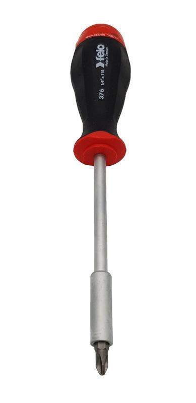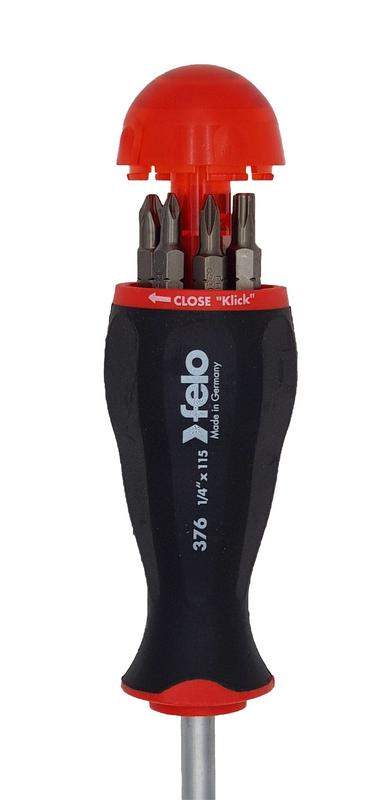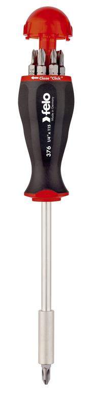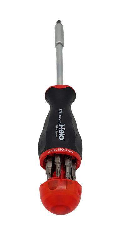 Универсальная отвёртка FELO с удлинённым стержнем, содержащая в комплекте 8 различных бит-насадок. Используется для монтажно-демонтажных работ с различного рода крепежом. Рукоятке имеет магазин с восемью битами различных типов. Смена насадок очень проста. Открытие или закрытие магазина происходит поворотом крышки на рукоятке. Все биты-насадки изготовлены из высококачественной хром-молибден-ванадиевой стали. Прочная двухкомпонентная рукоятка.