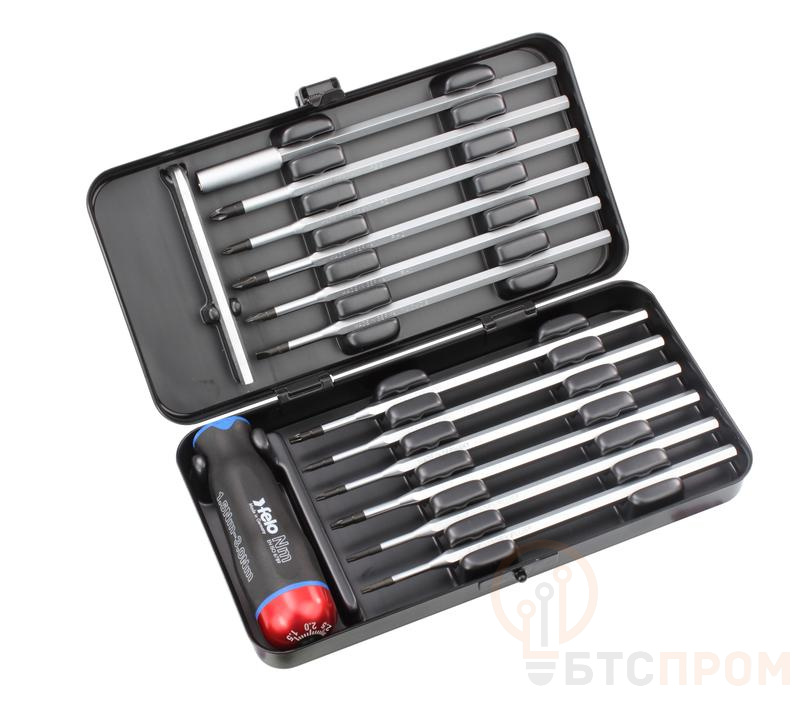 Динамометрическая рукоятка Felo серии Nm с набором сменных стержней предназначена для сборки ответственных электротехнических соединений, с заданным значением крутящего момента силы. Рукоятка имеет диапазон затягивания от 1.5 до 3.0 Нм (с шагом в 0,1 Нм). Гладкая бесшовная рукоятка имеет усовершенствованную эргономичную форму, удобно ложится в руку, не проскальзывает и снижает утомляемость. Каждая рукоятка индивидуально откалибрована и сертифицирована. С рукояткой применяются сменные стержни длиной 170мм, изготовленные из закаленной в масле хром-молибден-ванадиевой стали, износостойкость которой превышает технические требования DIN и ISO. Важно: нагружать отвертку следует равномерно, плавно и по часовой стрелке. Достижение заданного момента затяжки сопровождается щелком. Как только заданный момент затяжки достигнут, необходимо прекратить дальнейшую нагрузку на отвертку. Механизм блокируется при вращении против часовой стрелки (на ослабление винтов). Если стрелка переместилась за пределы шкалы повернув регулировочный ключ по часовой стрелке повторно выровняйте шкалу и стрелку. Состав набора: Cменные стержни: Torx 9 / Torx 10 / Torx 15 / IP 6 / IP 7 / IP 9 / IP 10 / IP 15 / SL 3,0x0,5 / SL 4.0x0,8 / PH1 / PH2 / PZ1 / PZ2 Магнитный адаптер - 1 шт Динамометрическая рукоятка 1,5 Nm - 3,0 Nm - 1 шт Ключ настройки - 1 шт Металлический кейс