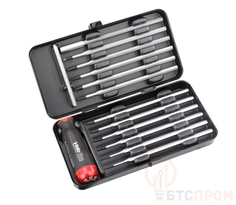 Динамометрическая рукоятка Felo серии Nm с набором сменных стержней предназначена для сборки ответственных электротехнических соединений, с заданным значением крутящего момента силы. Рукоятка имеет диапазон затягивания от 3.0 до 5.4 Нм (с шагом в 0,1 Нм). Гладкая бесшовная рукоятка имеет усовершенствованную эргономичную форму, удобно ложится в руку, не проскальзывает и снижает утомляемость. Каждая рукоятка индивидуально откалибрована и сертифицирована. С рукояткой применяются сменные стержни длиной 170мм, изготовленные из закаленной в масле хром-молибден-ванадиевой стали, износостойкость которой превышает технические требования DIN и ISO. Важно: нагружать отвертку следует равномерно, плавно и по часовой стрелке. Достижение заданного момента затяжки сопровождается щелком. Как только заданный момент затяжки достигнут, необходимо прекратить дальнейшую нагрузку на отвертку. Механизм блокируется при вращении против часовой стрелки (на ослабление винтов). Если стрелка переместилась за пределы шкалы повернув регулировочный ключ по часовой стрелке повторно выровняйте шкалу и стрелку. Состав набора: Cменные стержни: Torx 15 / Torx 20 / Torx 25 / IP 6 / IP 9 / IP 10 / IP 15 /SL 4,0x0,8 / PH1 / PH2 / PZ1 / PZ2; Магнитный адаптер - 1 шт Динамометрическая рукоятка 3.0 Nm - 5.4 Nm - 1 шт Ключ настройки - 1 шт Металлический кейс