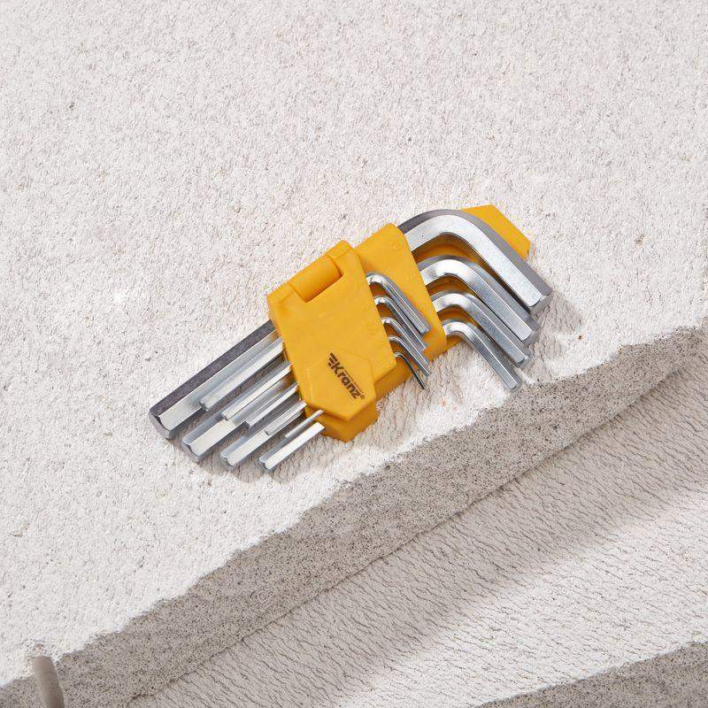 Набор ключей имбусовых KRANZ предназначен для работы с крепежом, оснащенным шлицом HEX (шестигранником). Ключи имеют Г-образную форму, изготовлены из высококачественной стали. Антикоррозийное покрытие обеспечивает надежную защиту инструмента от негативных внешних воздействий. Это значительно продлевает срок службы. Технические характеристики: Тип: набор HEX Форм-фактор: Г-образный Минимальный размер: 1,5 мм Максимальный размер: 10 мм Тип ключей: короткие Количество в наборе: 9 Марка стали: CrV Состав: 1,5-2-2,5-3-4-5-6-8-10 мм Ключи изготовлены из хромованадиевой стали Твердость рабочей части: 48-50 HRС Для удобства хранения ключи поставляются в пластиковом чехле