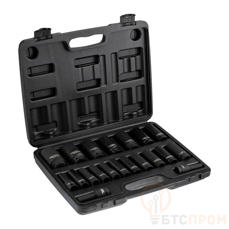 Набор предназначен для профессионального использования на СТО и проведения строительных работ. В наборе содержатся ударные глубокие (78 мм) шестигранные силовые головки размером от 8 до 32 мм и присоединительный квадрат 1/2". Головки выполнены из специальной хром-молибденовой стали, устойчивой к экстремальным нагрузкам, что придает им высокую прочность. Головки оптимально подходят для использования с пневматическими, электрическими и ручными гайковертами. Набор состоит из 20 предметов и поставляется в пластиковом кейсе.