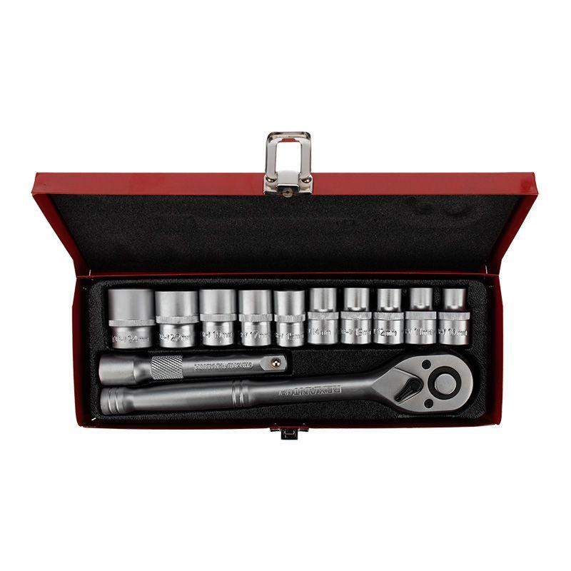 Набор головок REXANT используется для монтажа и демонтажа резьбовых соединений. Инструменты изготовлены из хромованадиевой износостойкой и долговечной стали с хромоникелевым покрытием. В наборе 10 съемных торцевых головок: 10, 11, 12, 13, 14, 15, 17, 19, 22 и 24 мм, которые имеют 6-гранный зев и посадочное место для присоединительного квадрата 1/2”. В комплект входят: ключ-трещотка с переключателем и удлинитель 125 мм. Изделия поставляются в удобном металлическом кейсе.