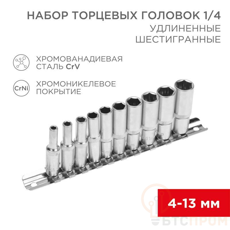 Набор удлиненных торцевых головок REXANT используется для монтажа и демонтажа резьбовых соединений. Широко применяется при ремонте автомобилей и различного оборудования. Инструменты изготовлены из хромованадиевой износостойкой и долговечной стали с хромоникелевым покрытием. Твердость материала рабочей части головок – 42 HRС. В набор входят 6-гранные удлиненные торцевые головки на планке под квадрат 1/4" следующих размеров: 4, 5, 6, 7, 8, 9, 10, 11, 12 и 13 мм. Ярко-красная полоска, нанесенная на головки, предназначена для удобного поиска. Изделия поставляются на металлической планке и упакованы в блистер.