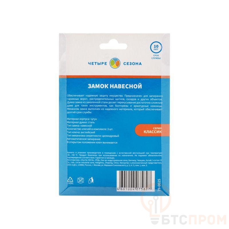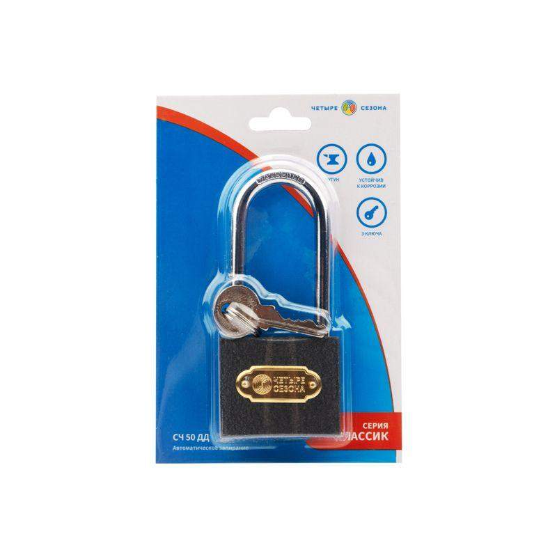Навесной замок ЧЕТЫРЕ СЕЗОНА предназначен для защиты личного имущества. Используется для запирания гаражных ворот, распределительных щитков, складов и других объектов. Дужка замка выполнена из закаленной стали, что делает ее перекусывание достаточно сложным даже для таких инструментов, как болторезы и арматурные ножницы. Дужка имеет удлиненную форму, что позволяет устанавливать замок в труднодоступных местах. Надежный механизм из долговечного материала гарантирует стабильную работу и безопасность на протяжении всего срока эксплуатации. В комплекте 3 ключа, поэтому при потере одного у вас останутся запасные. В открытом положении ключ вынимается.