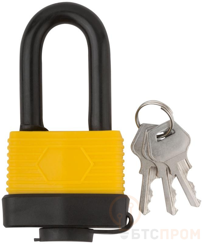 Всепогодный. Автоматическое запирание. Материал: инструментальная сталь, пластик. 3 ключа. С длинной дужкой. Пластиковый чехол на корпусе и специальная заглушка отверстия для ключа предохраняет замок от ржавчины. Упаковка: блистер.