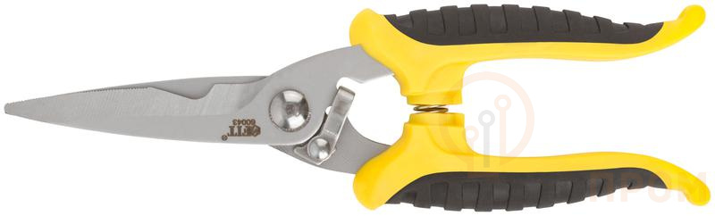 Ножницы электрика FIT IT предназначены для резки проводов и кабелей, проволоки, картона, бумаги, кожи, тканей, веток, цветных листовых металлов. Лезвия выполнены из стали 65Mn, отличающейся ударной вязкостью и стойкостью к истиранию. Зубцы на лезвии предотвращают проскальзывание обрезаемого материала. Мягкие эргономичные рукоятки обеспечивают надежный хват. Фиксатор удерживает ножницы в закрытом положении.
