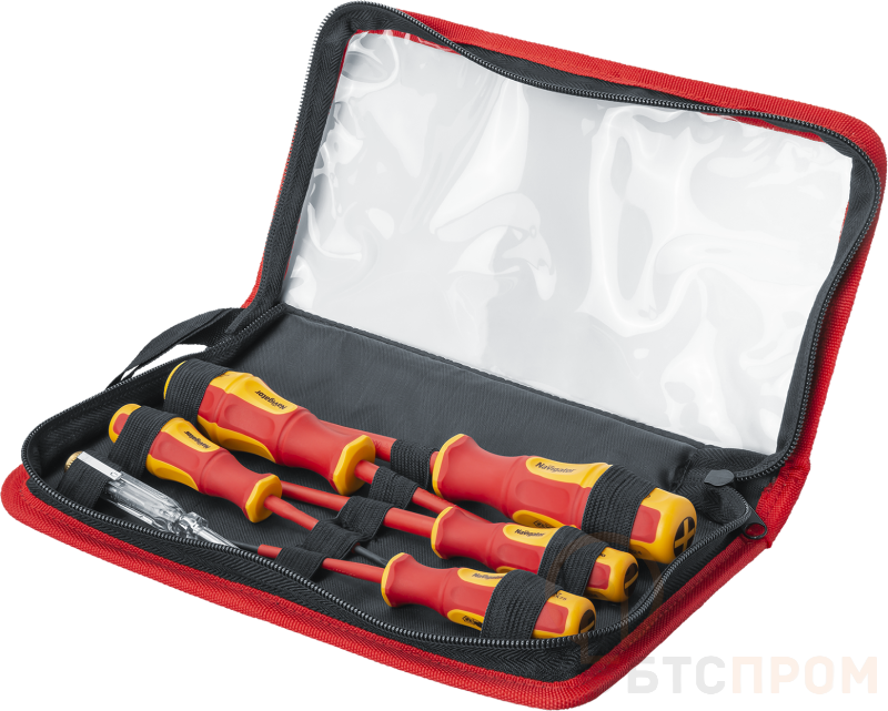 Набор инструмента диэлектрический NAVIGATOR 93430 (NHT-Оtd03-H6) — это профессиональный комплект из 6 предметов, предназначенный для безопасной работы с электрооборудованием под напряжением до 1000 В. Все инструменты в наборе изготовлены из высококачественной кованой хромованадиевой стали и имеют двухкомпонентные изолирующие рукоятки, обеспечивающие надежную защиту от поражения электрическим током.