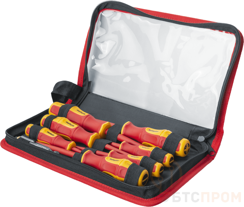 Набор инструмента диэлектрический NHT-Оtd03-H8 от бренда NAVIGATOR — это профессиональный комплект для безопасной работы с электрооборудованием под напряжением до 1000 В. Набор укомплектован восемью основными предметами: отвертками шлицевыми и крестовыми различных размеров, пассатижами, бокорезами и универсальным ножом.